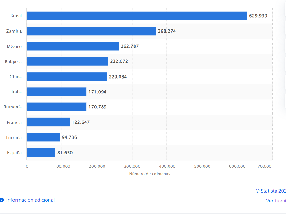 A few figures and numbers about beekeeping. According to Statista.com, in 2021, Spain, with its 81.650 hives is ranked in 10th position among the countries in the world with most registered organic hives, while Brasil, is the world leader with 629.934 hives.